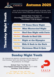 In Autumn 2025, these events will be running at St Mary’s Church Lutterworth, usually beginning in the Churchgate Community Centre. The dates for this term are shown on the flyer at the bottom of the page.